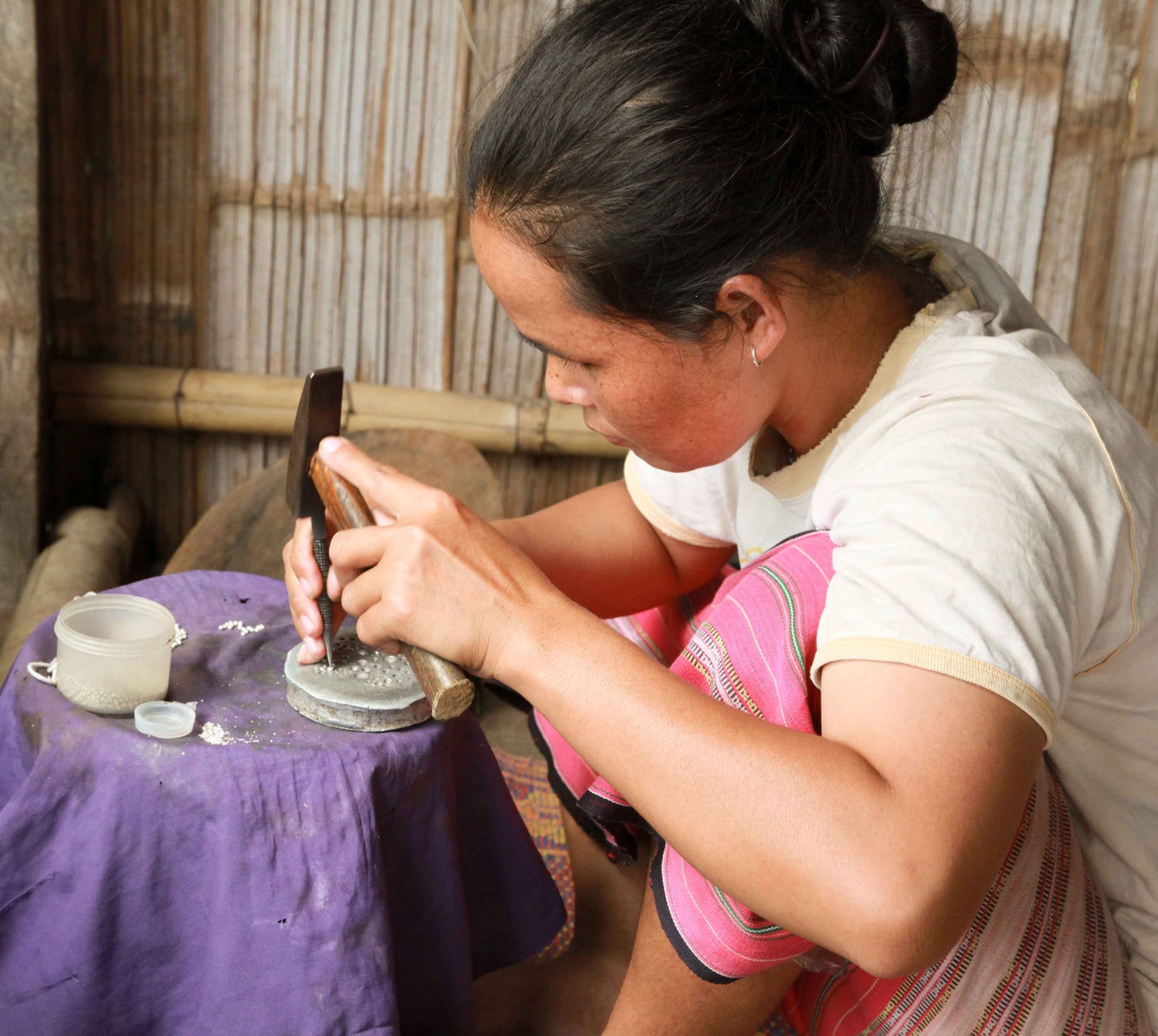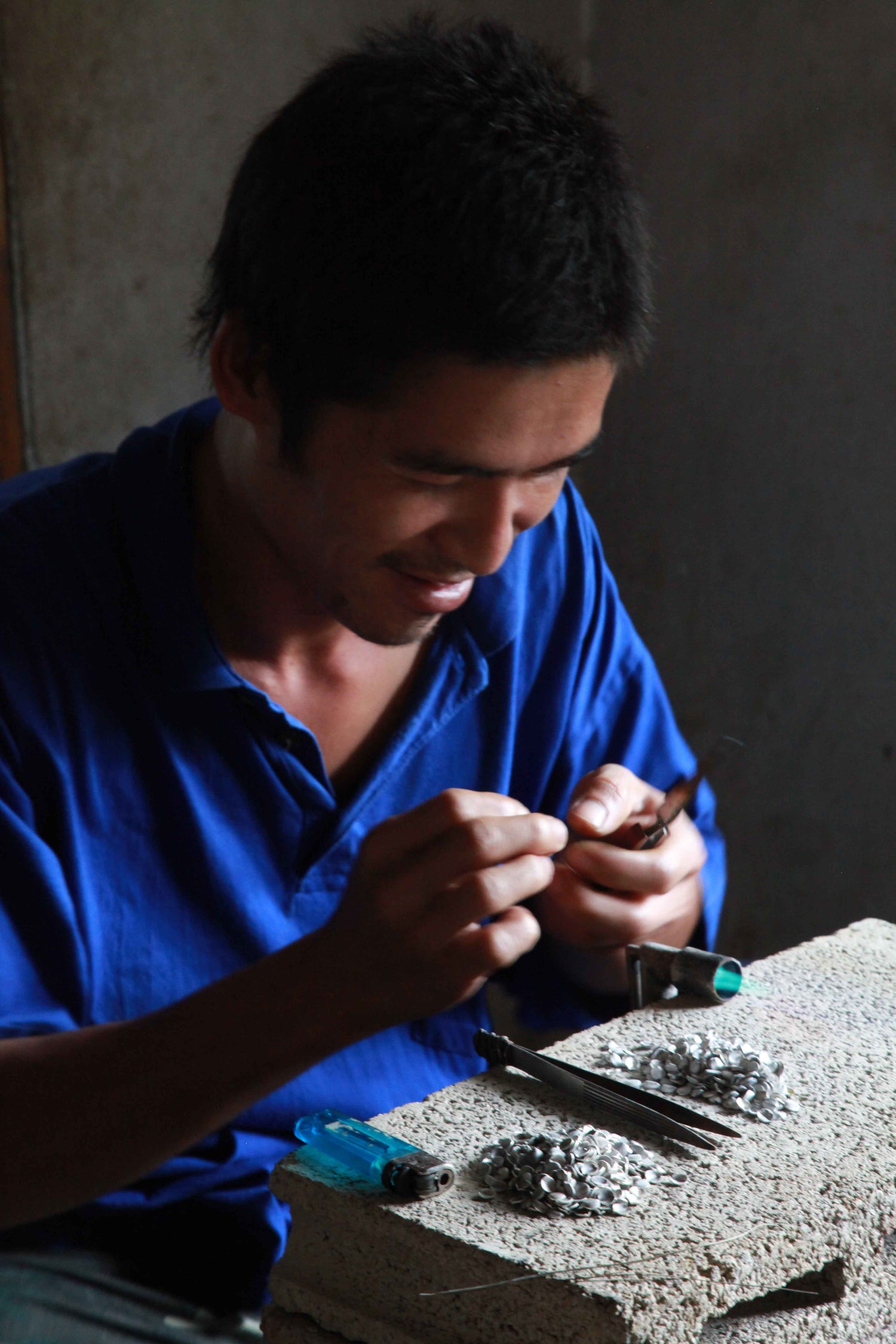 En 2013, ALLER SIMPLE est allé à la rencontre des artisans Karen dans un village isolé dans la montagne situé dans le Triangle d’or. Dans chaque habitation, il y a un poste de travail de l’argent. Chaque famille est spécialisée dans la réalisation de certaines pièces ou de certaines techniques : martelage, ponçage, ciselage, poinçonnage, etc.