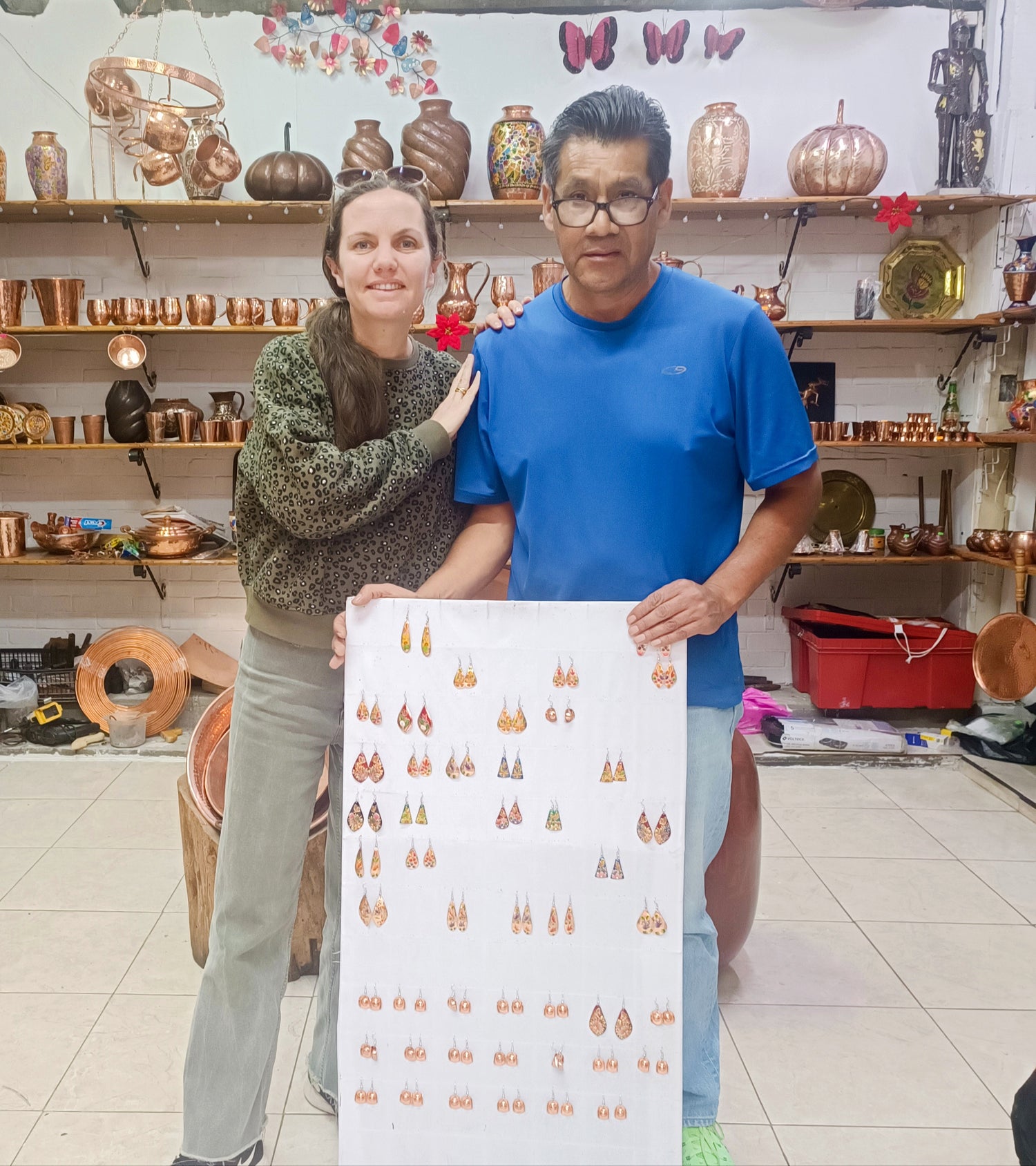 En 2025, nous sommes allés à la rencontre des artisans de Taxco spécialisés dans le travail de l’argent et de ceux de Santa Clara Del Cobre qui travaillent le cuivre. Les Boucles d’oreilles en cuivre sont réalisées par Salvador et sa famille. A Taxco, ville perchée à flanc de montagne près des mines d’argent, toutes les familles travaillent l’argent depuis de nombreuses générations